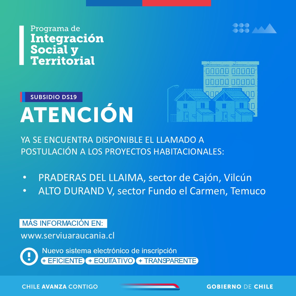 Serviu Araucanía anuncia el llamado a postulación para la asignación de cupos de viviendas del Programa de Integración Social y Territorial (DS19), en los siguientes proyectos: “Condominio Alto Durand V” en el sector de Fundo el Carmen, en Temuco, y el proyecto “Praderas del Llaima 3” etapa 1, ubicado en el sector de Cajón, comuna de Vilcún.